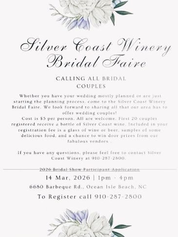 Please join us for our Bridal Fair. First 20 couples registered receive a bottle of wine. Families and friends are welcome. Cost is $5 per person. This includes a glass of wine or beer, chance to win door prizes, and samples of delicious food. Pre-registration required call 910-287-2800. Wedding Vendors email events@silvercoastwinery.com